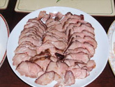 そうこうしているうちに、出る幕なかった焼き豚がオーブンで 出来あがり、スライスして皿に盛る。 |